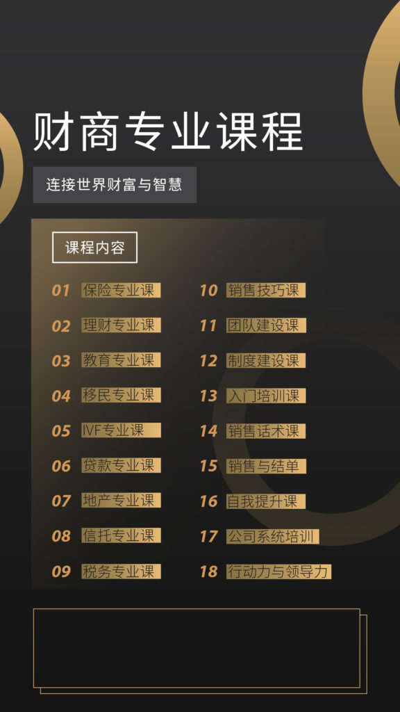 涵盖贷款、房产、理财、税务、保险、信托、教育、移民、健康、IVF等十余项课程领域,并提供覆盖线上和线下多种渠道的互动答疑服务,既可以一站式满足参与者在实际生活中对跨领域业务的需求,还可以同时考取多个专业执照,一举两得为自己周围的朋友与客户提供全方位的产品服务。
